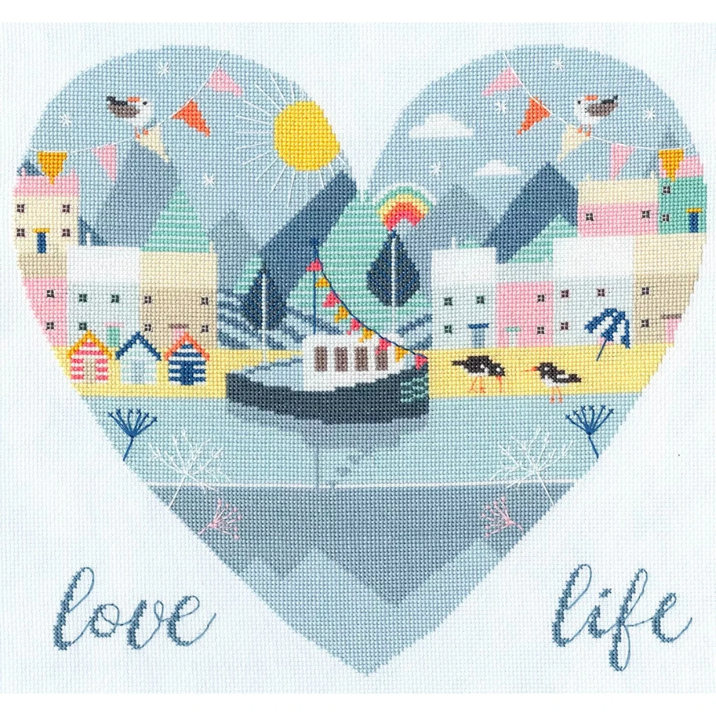 This cross stitch kit is perfect for anyone who loves the great outdoors. Stitched on 14-count cloudy blue Aida, the design forms a heart with the words “live free” at the bottom.