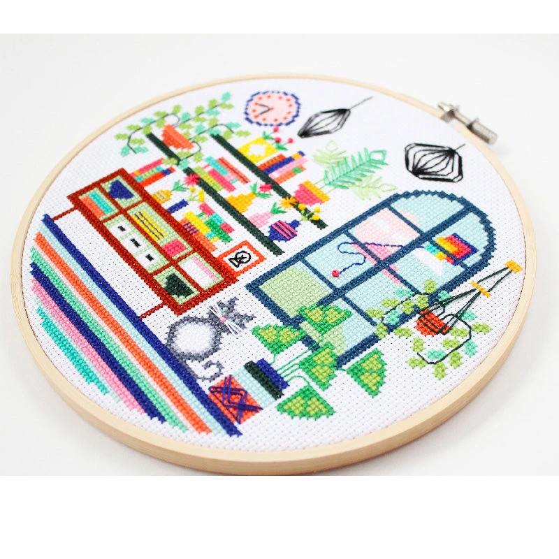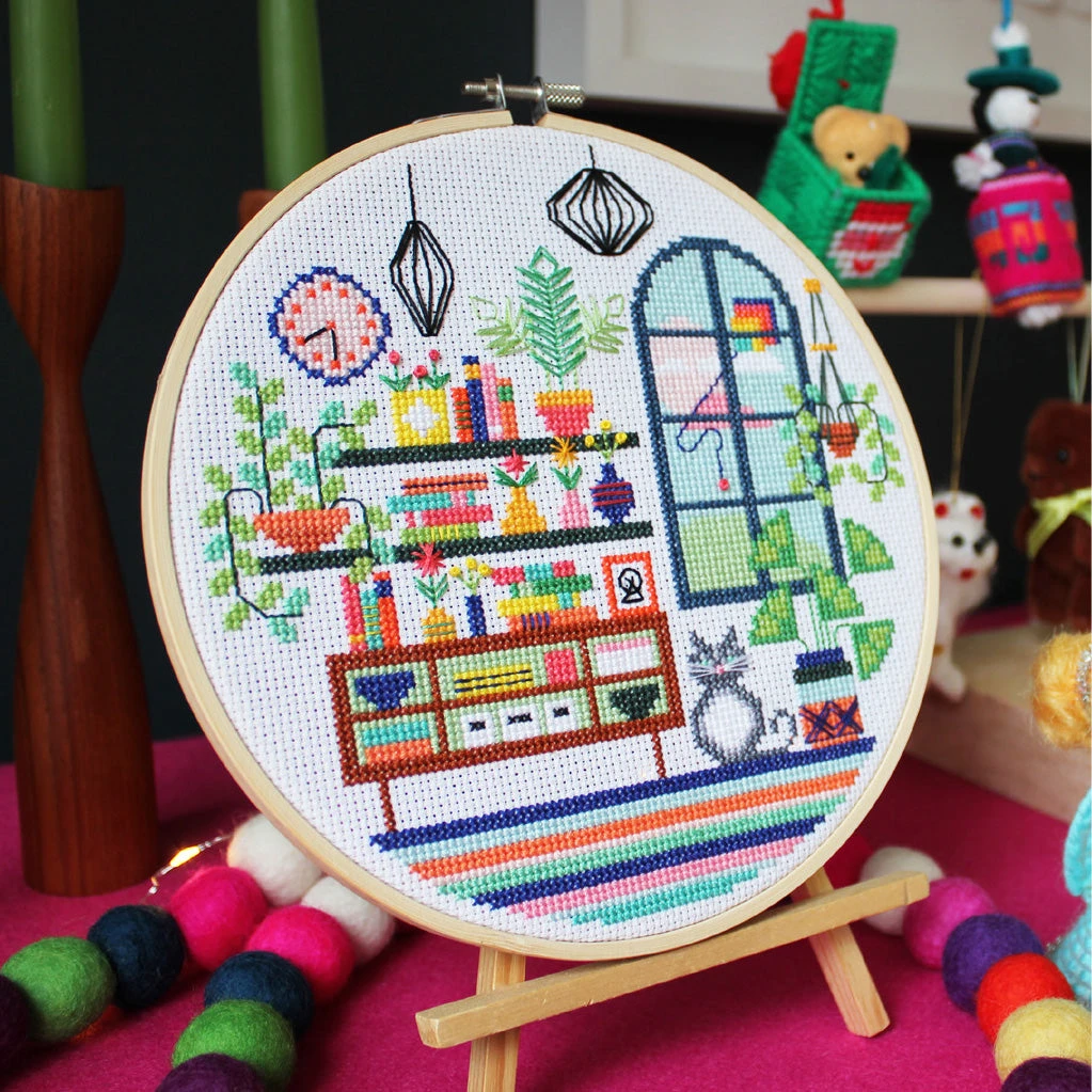 Welcome to Luna’s Living Room! This fun cross stitch kit by Canadian artist Diana Watters is part of her Murder Mystery Series in which each room holds a clue to solving a murder mystery. There are five rooms in total, and you’ll need to stitch them all to solve it!Â