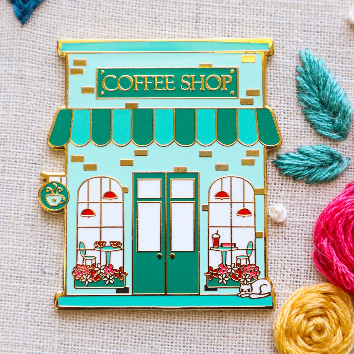 Stitch in cozy café style with the Coffee Shop needle minder by Flamingo Toes. Part of the charming Main Street series, this design features a mint-green storefront with window seating, floral boxes, and even a snoozing cat—perfect for bringing a little warm-and-fuzzy coffee shop magic to your stitching corner.