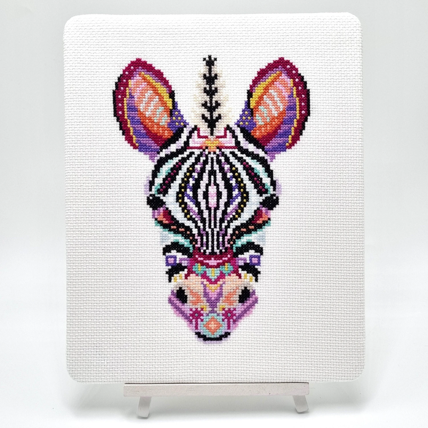 - Model was stitched on 14-count Aida in White using threads by DMC