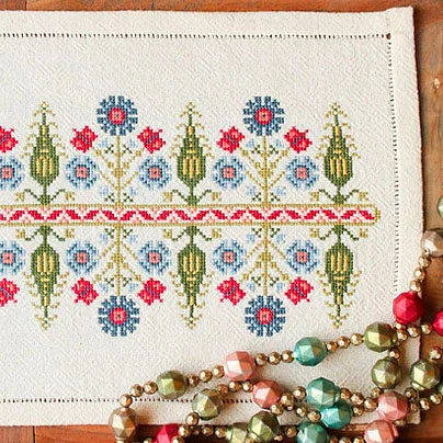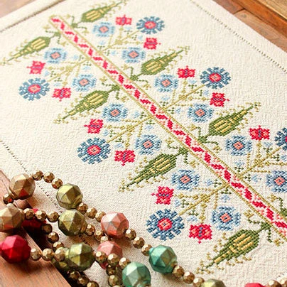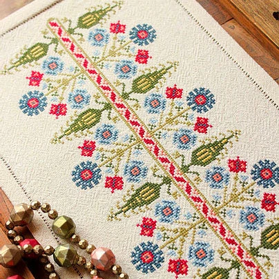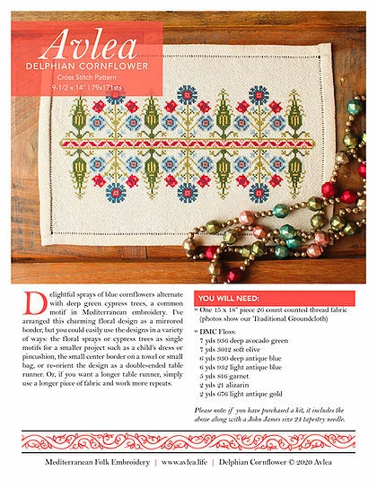 Delightful sprays of blue cornflowers alternate with deep green cypress trees, a common motif in Mediterranean embroidery. The piece can be finished as a table mat as shown, or it would look lovely framed. The choice is yours!