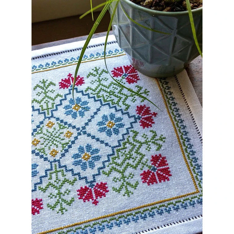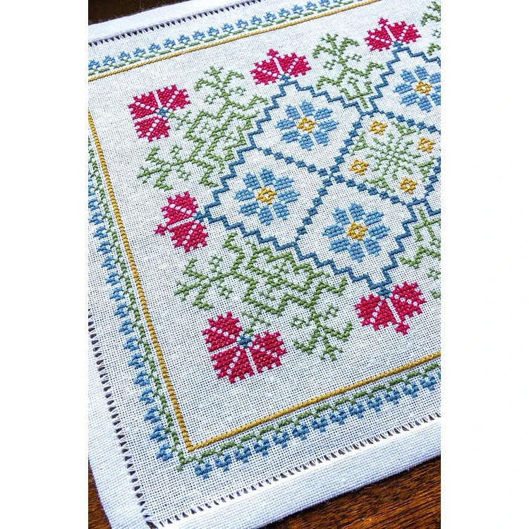 This Mediterranean inspired cross stitch kit by Avlea evokes a stitched garden. Graceful branches alternate with stylized carnations and bluebells in a trellis framework. This design creates a charming small table mat or can be used for a cushion cover or wall hanging.