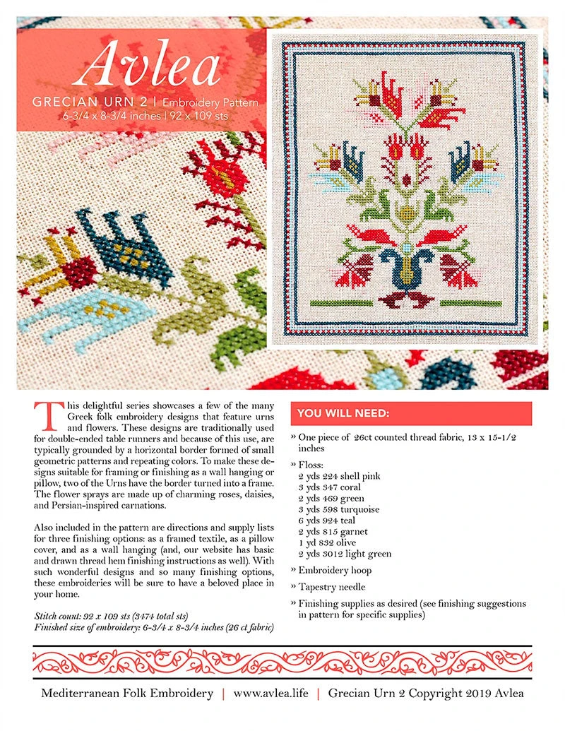 This simple yet stunning design by Avlea is a modern interpretation of a vintage Greek embroidery pattern. The Grecian urn design, traditionally used on table runners, is grounded by a horizontal border formed of small geometric patterns and repeating colors.