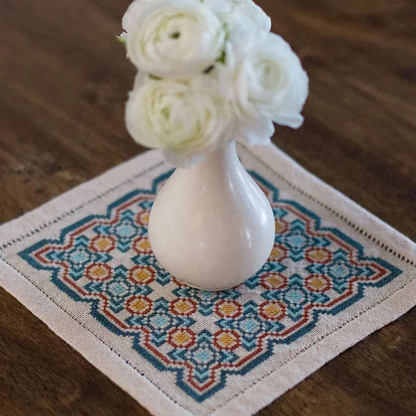 The design is stitched on a traditional cotton groundcloth that has an open weave and a soft hand. The kit includes everything you need, so it’s a perfect choice for beginners.