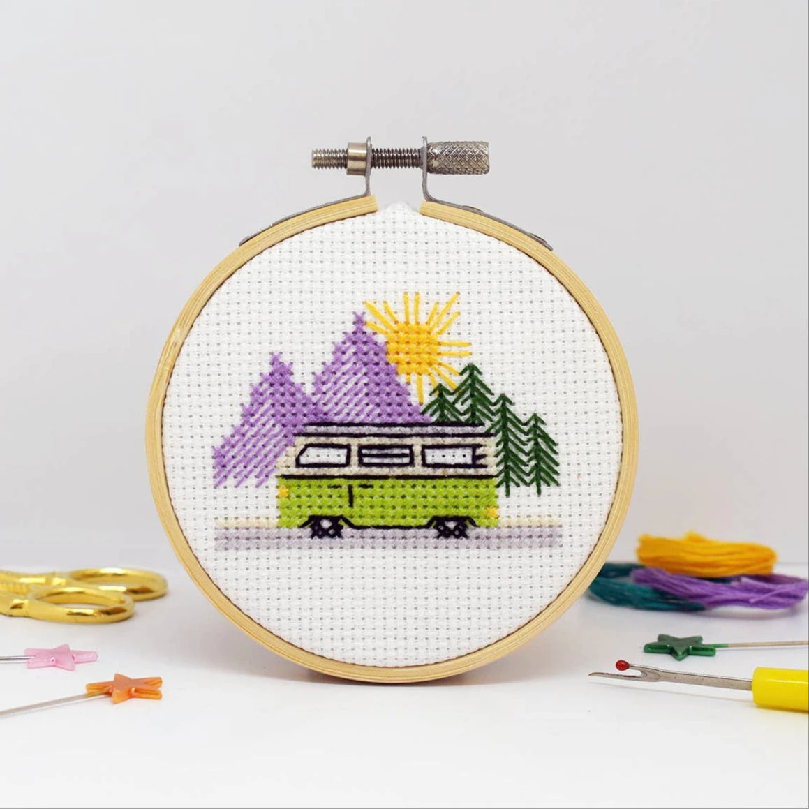 Hit the road (or your sofa) with this charming camper van cross stitch kit by The Make Arcade. Featuring a retro van, pine trees, purple mountains, and a bright sun, this mini project is like a little vacation in hoop form. It’s a fun and relaxing way to unwind—whether you’re on holiday or just dreaming of one.