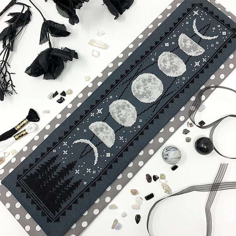 Stitch the phases of the moon with this cross stitch pattern by Tiny Modernist. The design is available as a printed hardcopy pattern. If you want to get up and stitching quickly, save yourself the time of collecting all the supplies and purchase one of our bundle options which includes the pattern along with fabric, thread, and needles.