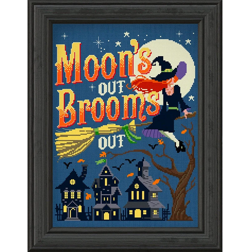 The moon is out and so are the brooms in this Halloween cross stitch pattern by Autumn Lane Stitchery.