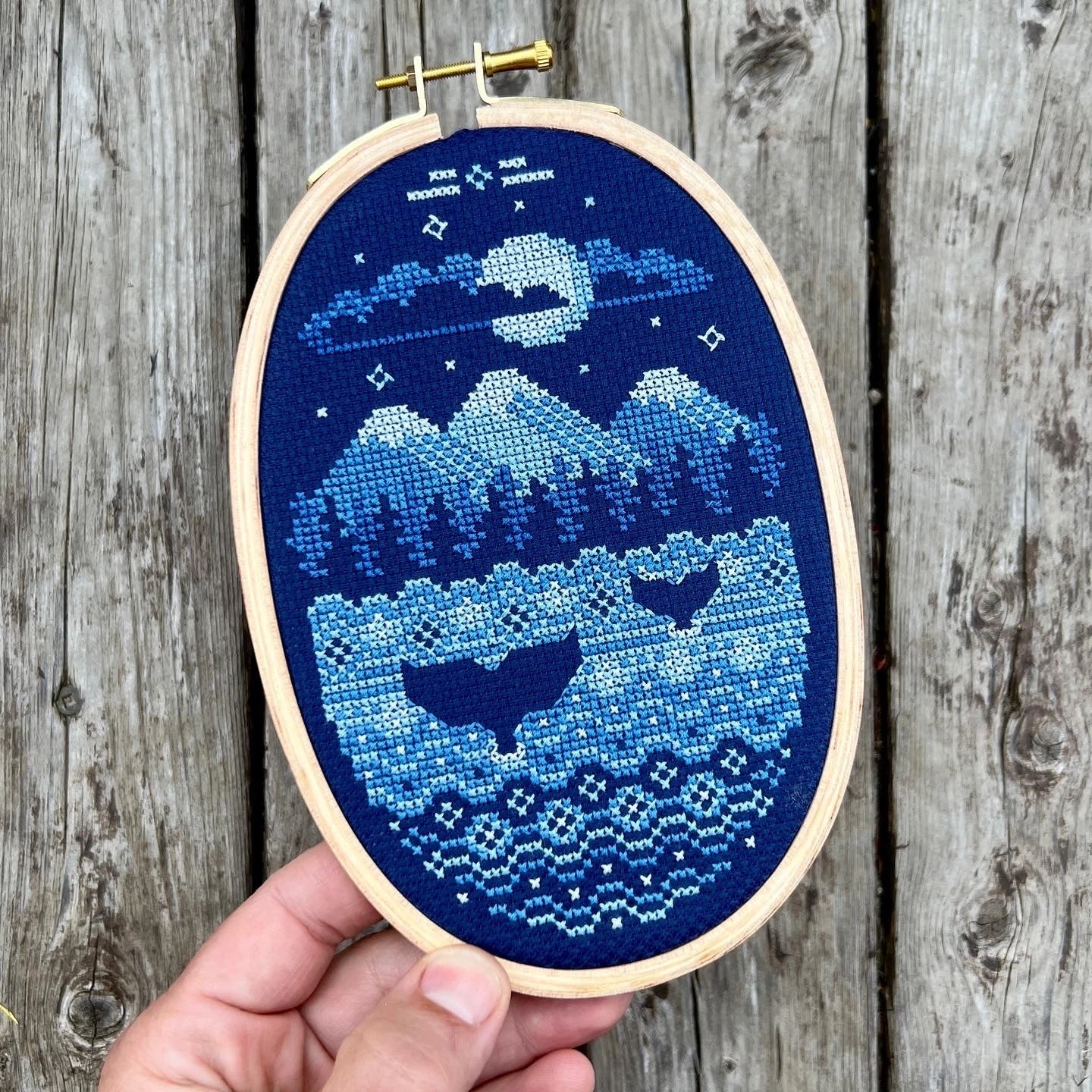 This counted cross stitch pattern by Pigeon Coop features a magical sea coast landscape set under a blue moon.