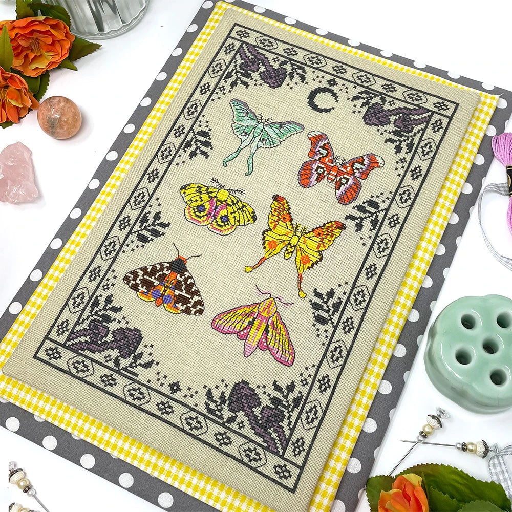 This pretty cross stitch pattern by Tiny Modernist features six bright moths surrounded by a decorative mushrooms and moon border.