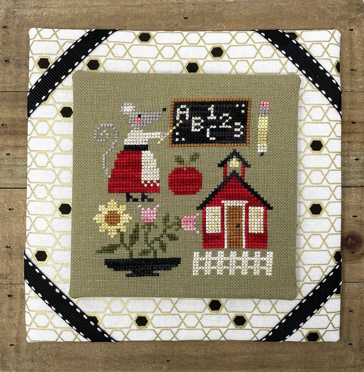 This whimsical cross stitch design by Tiny Modernist features a mouse teacher at the chalkboard, complete with a classic red schoolhouse, apples, sunflowers, and sweet back-to-school vibes.
