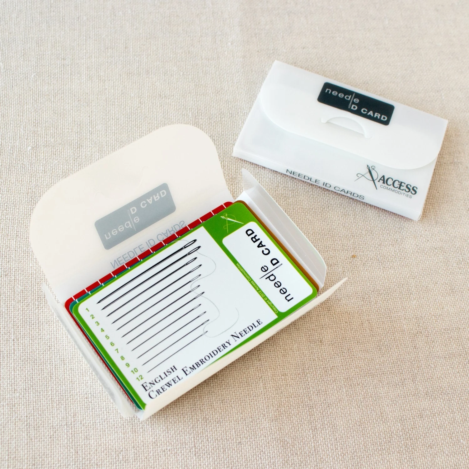 If you have a stash of unidentified needles lying about (what stitcher doesn’t?), this handy set of cards will help you figure out which needle is which. Each card in the set depicts a different type of hand sewing needle with descriptions and actual size drawings of the various needles. To figure out which size needle you have, simply lay it on the card.