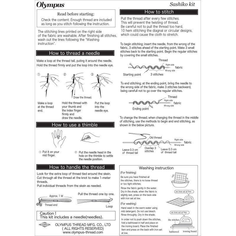 The package contains the fabric panel only. Sashiko thread, needles, and a thimble are recommended and sold separately. You will need 4 skeins of thread for the stitching (80m total), and 1 skein of contrasting thread for the weaving (20m total).