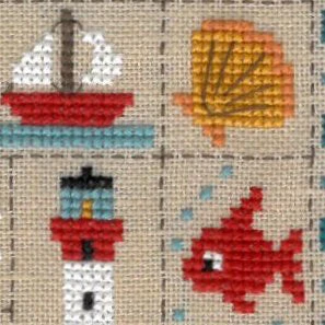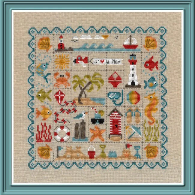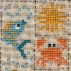 This patchwork style cross stitch pattern by French designer Jardin Prive is just right for a day at the beach. The design features fun seaside motifs surrounded by a scalloped border.