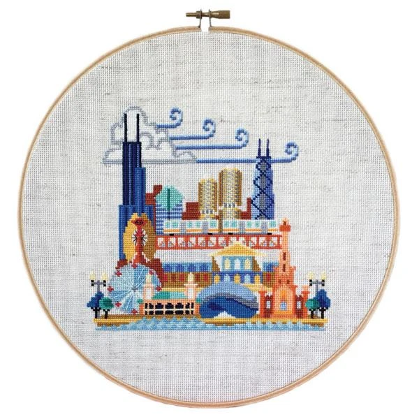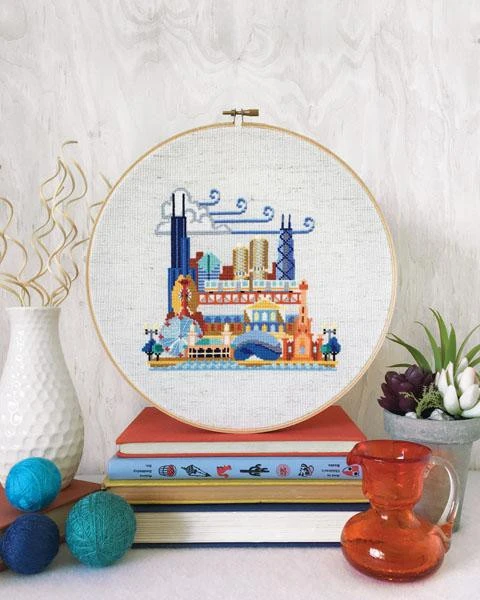 Part of the popular Pretty Little Location series by Satsuma Street, this cross stitch pattern of Chicago features all the important landmarks including Willis Tower, the Hancock Center, the Bean, an “El” train, and more. And of course, it wouldn’t be the Windy City without a blustery cloud! The pattern comes with a helpful key that identifies each of the buildings.