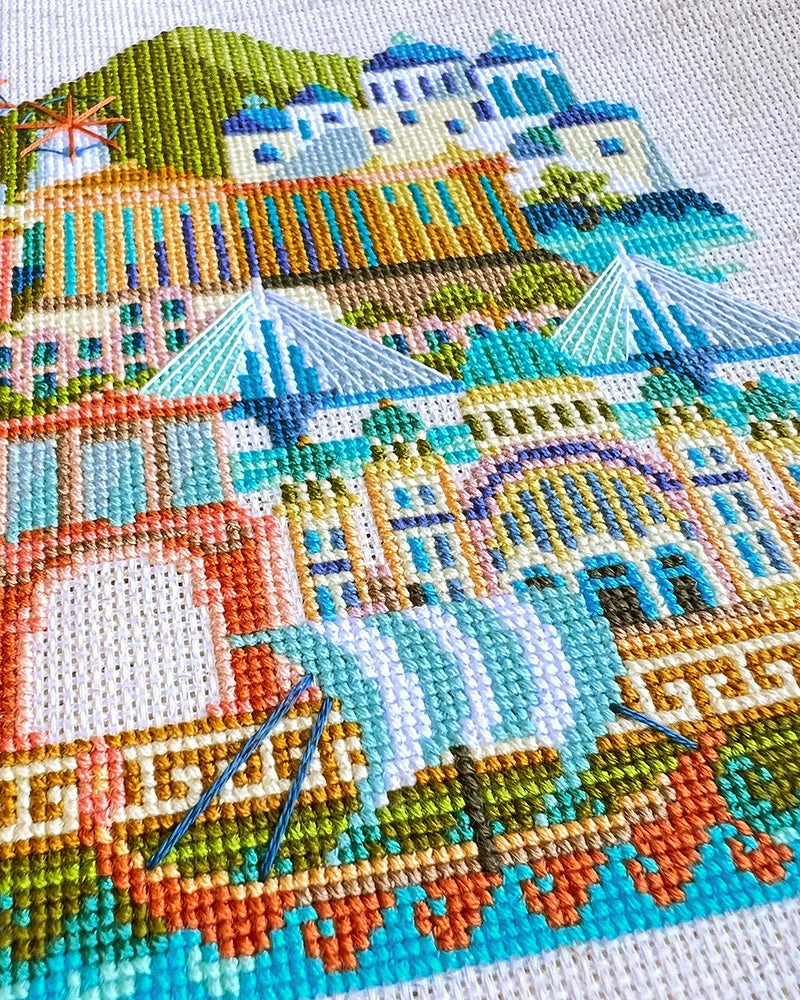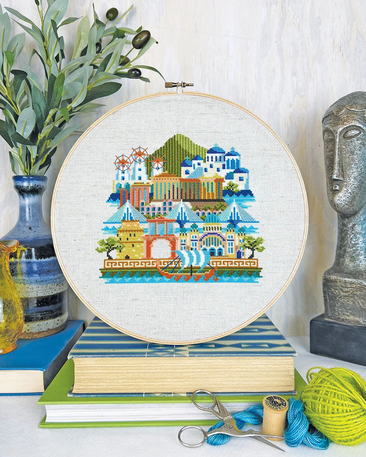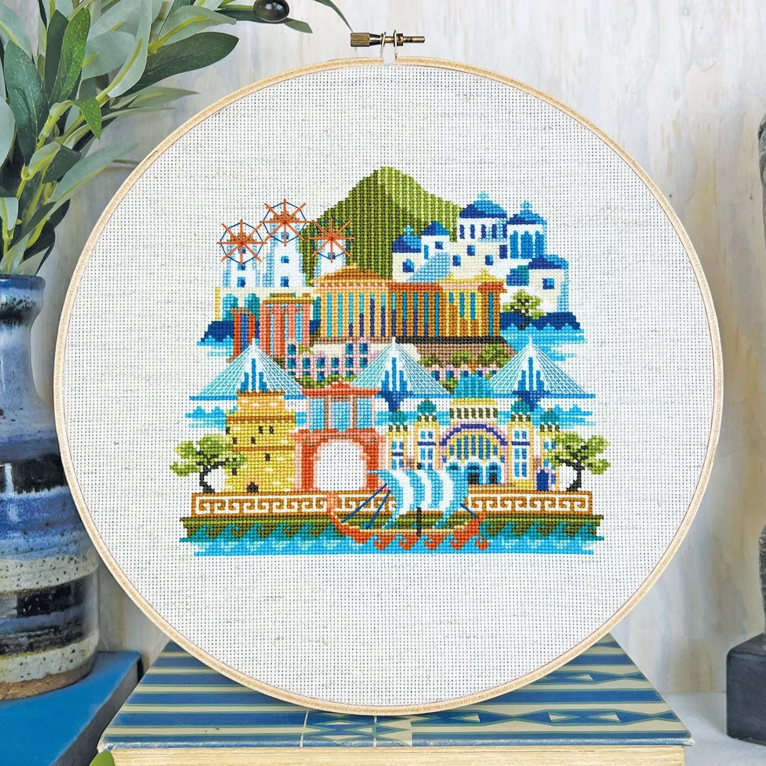 Part of the popular Pretty Little City series by Satsuma Street, this vibrant cross stitch pattern of Greece features popular landmarks like the Parthenon, Hadrian’s Arch, Santorini, Mykonos, and Mt Olympus!