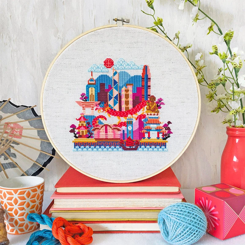 Welcome to Pretty Little Hong Kong! This modern cross stitch pattern by Satsuma Street features many favorite landmarks including the Peak Tower, Central Plaza, the Bank of China building, the “Big Buddha”, and of course a beautiful dragon weaving through the city!