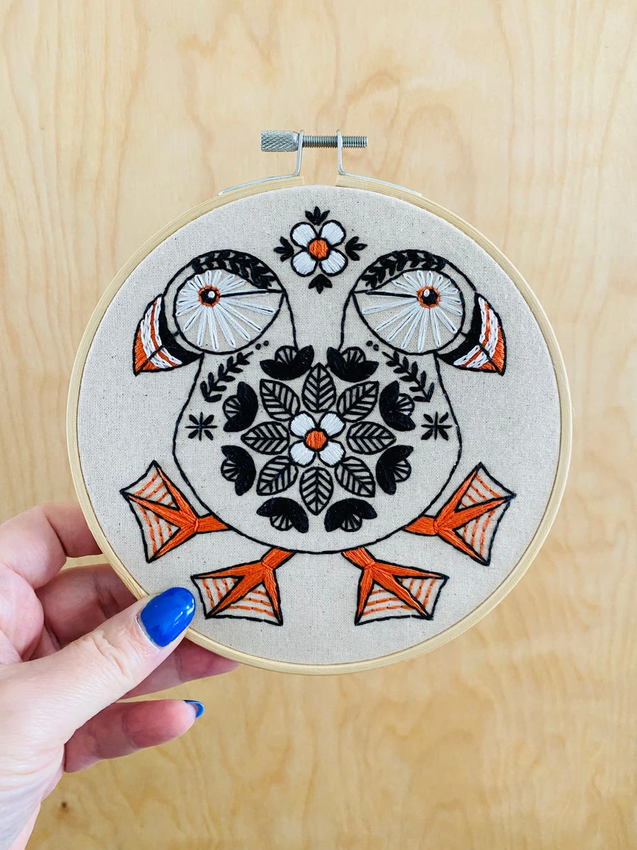 Stitch a pair of adorable puffins with this Scandinavian folk art inspired hand embroidery kit by Nova Scotia based Hook, Line & Tinker.