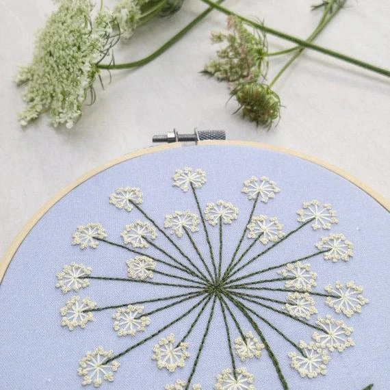 The pattern is pre-printed on high-quality kona cotton fabric, so there is no need for transferring or tracing. You can get stitching right away! The kit has everything you need. The finished design is sized to fit nicely in a 6” hoop.