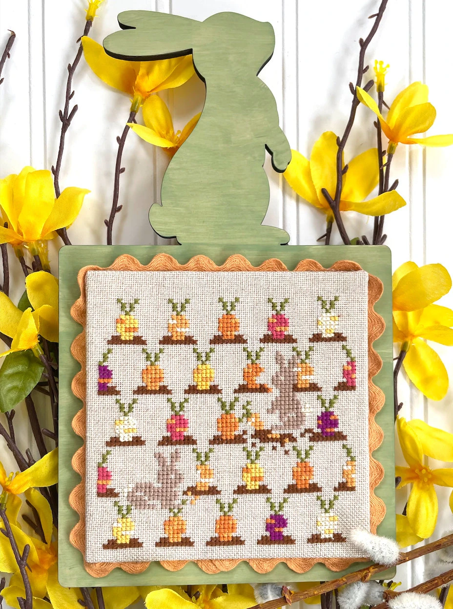 Bunnies hop among the carrots in this sweet counted cross stitch pattern by Petal Pusher.