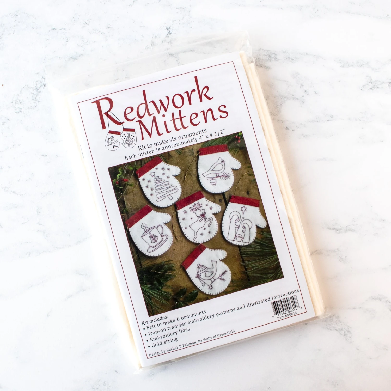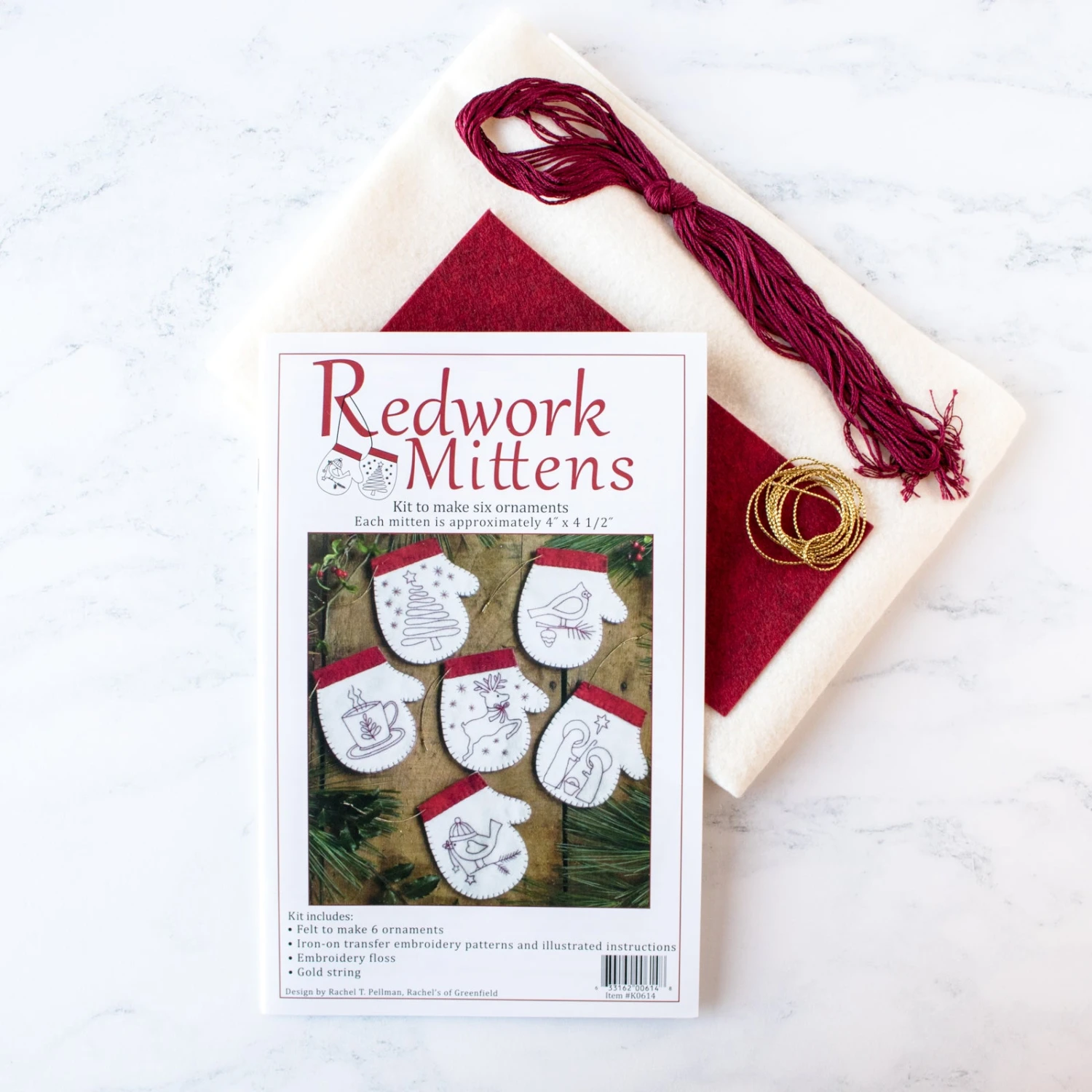 Each kit comes with material to make six mittens, including wool felt, embroidery floss, gold string for hanging, precise patterns printed with iron-on transfer ink, and illustrated instructions on how to stitch and make the mittens. Each finished mitten measures approximately 4” x 4-1/2”.