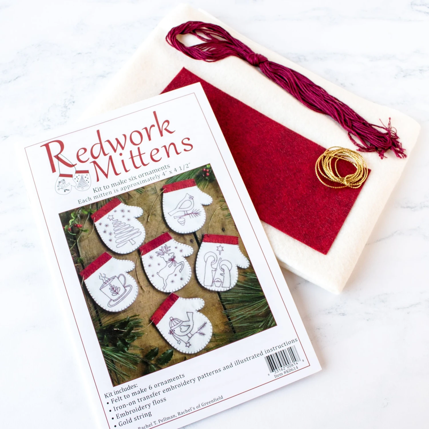 These adorable wool felt mittens are embellished with simple embroidery stitches to create six festive designs in a traditional redwork style. Designed as ornaments, the mittens also have a pocket that is perfectly sized to hold a gift card or other small treasure.