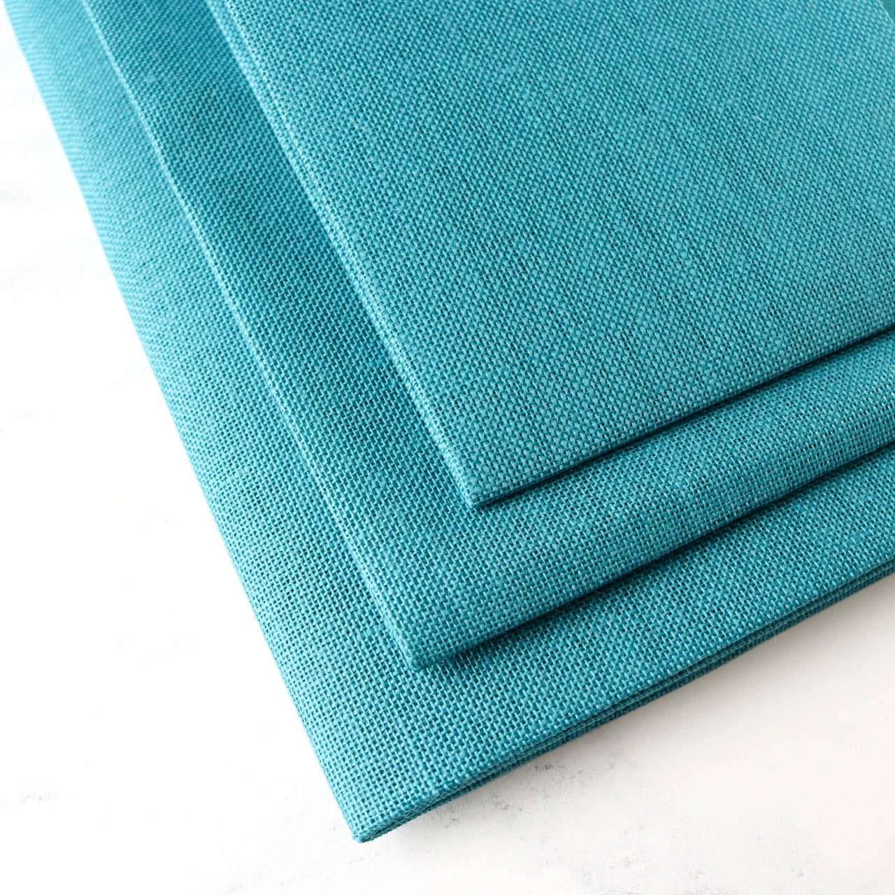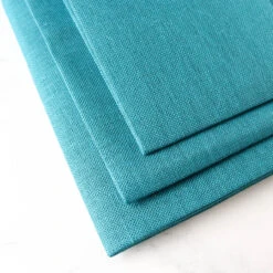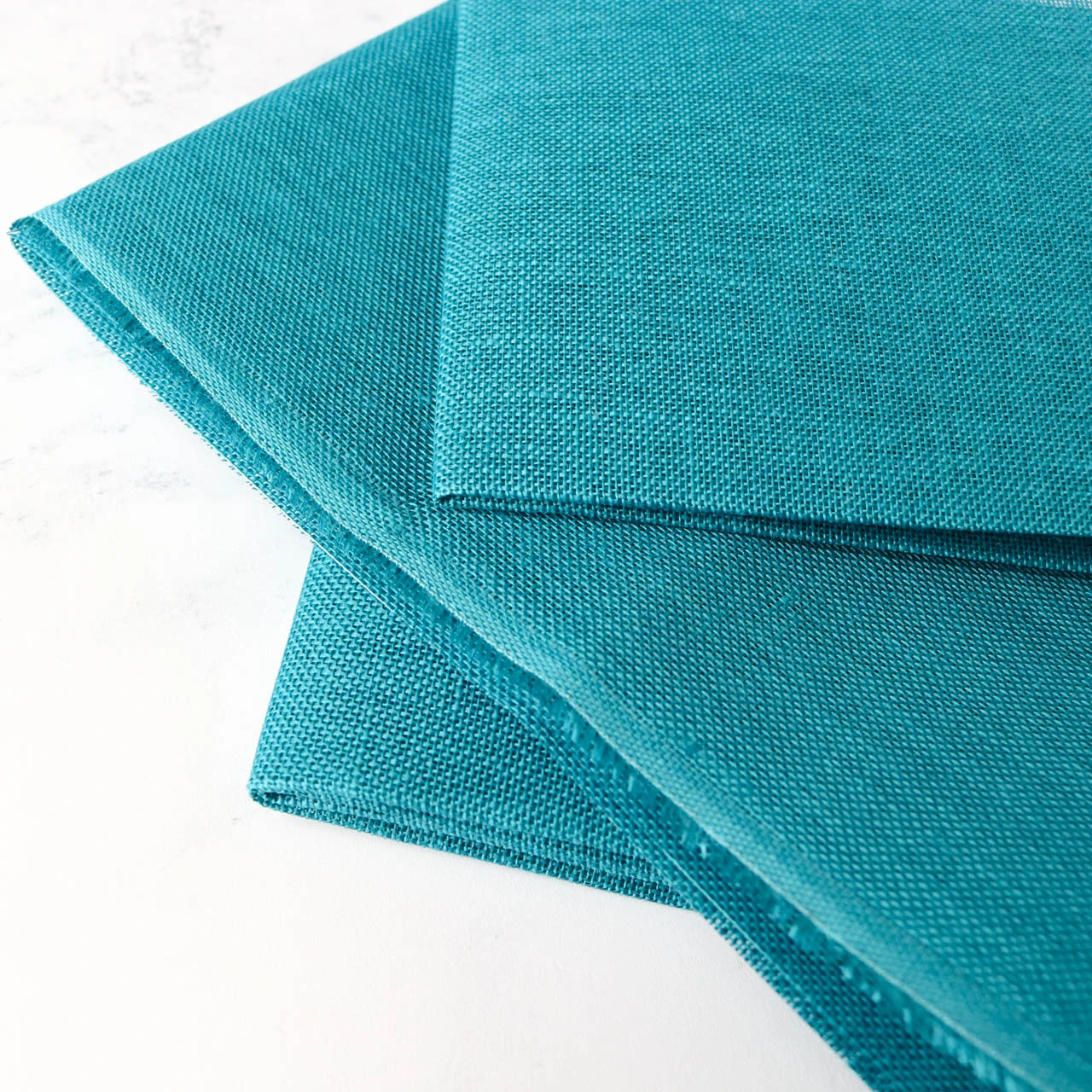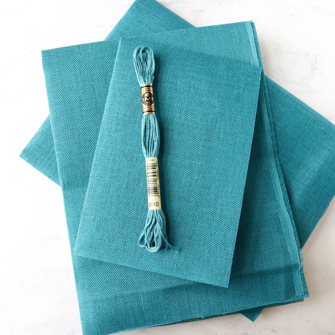 Linen has an open weave and a refined look that is perfect for cross stitch and embroidery. This deep aqua linen is the equivalent of DMC embroidery floss color #3810. The linen is stiff to start, but will soften up as you work with it.