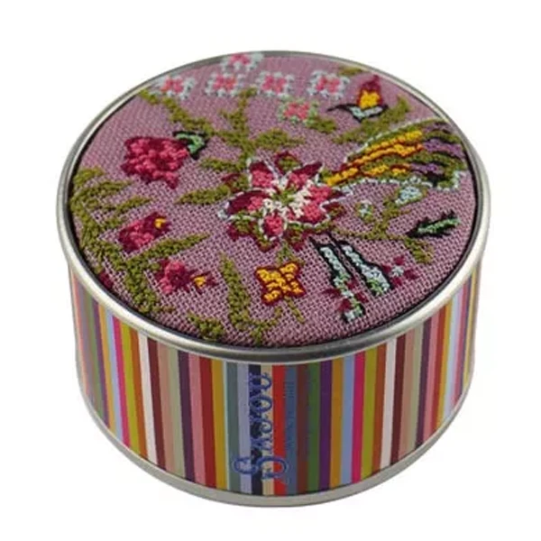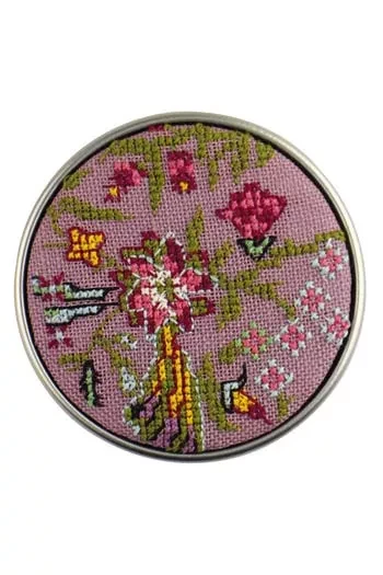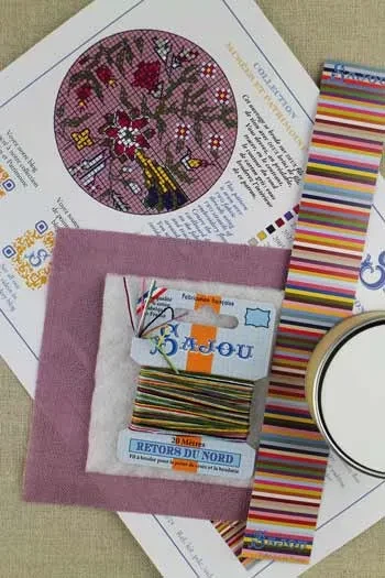 Stitch a piece of textile history with this richly detailed round box kit from Maison Sajou of France. The “Jaipur” design is inspired by traditional indienne floral prints and comes from Sajou’s prestigious Museums and Heritage Collection. Stitched on linen with ten shades of Retors du Nord floss, the project finishes inside a charming striped tin—perfect for displaying your work in a beautifully practical way. This is a small but intricate project best suited for intermediate stitchers.