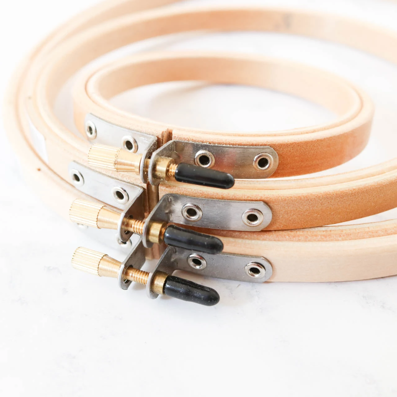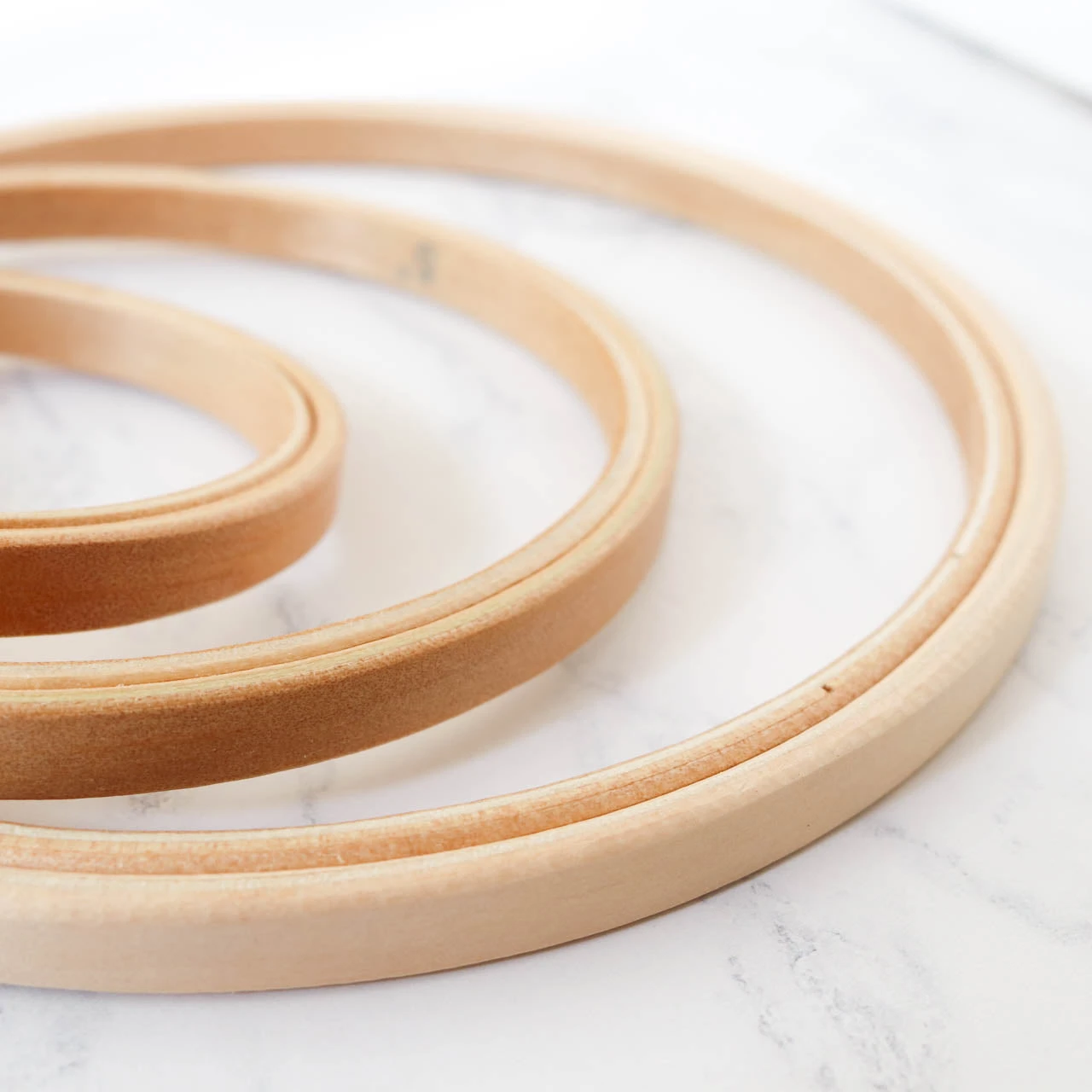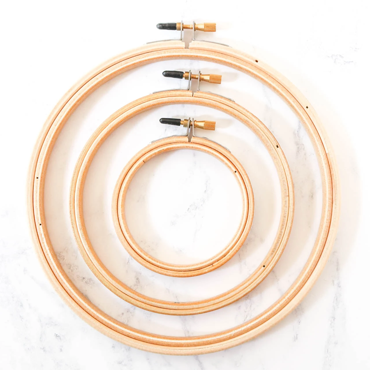 The hoops are available in a range of sizes, from 3 inches to 10 inches in diameter. They are perfect to use while stitching, or for framing your finished piece.