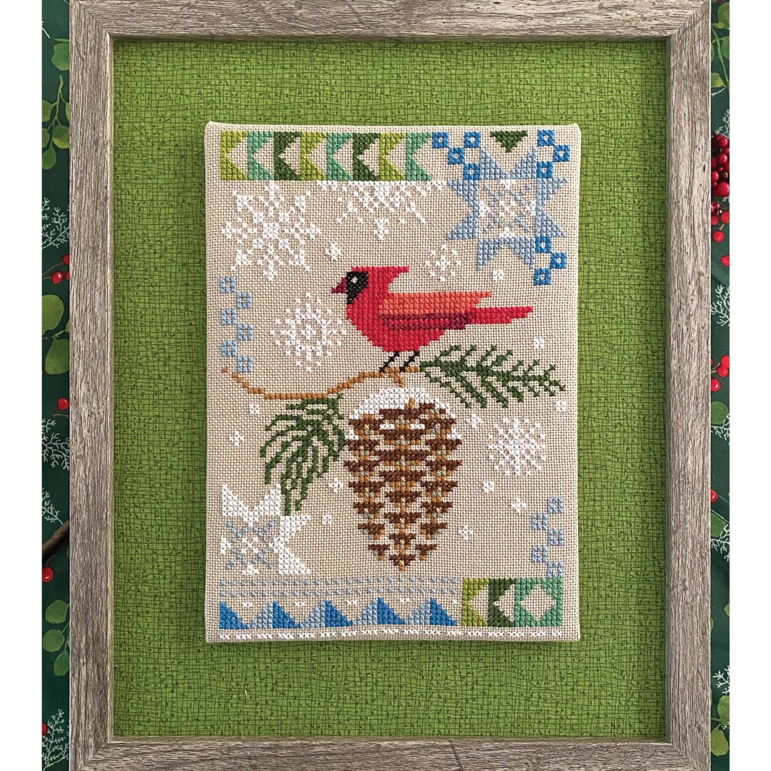 Celebrate the winter season with this counted cross stitch pattern by Robin Pickens featuring a cheerful cardinal perched on his favorite pinecone. Snowflakes of various sizes dance around him, capturing the magic of winter. Decorative borders inspired by quilt patterns add an extra touch of color and charm.