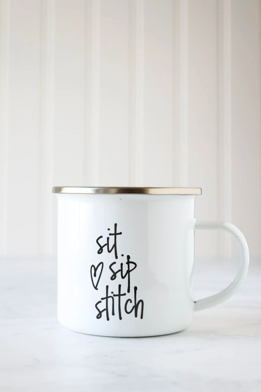 Enjoy some quiet stitching time with this 10 ounce enamel camp mug. Made of stainless steel, the mug is coated in white gloss enamel and is good for both hot and cold beverages. It’s lightweight but sturdy, perfect for travel, camping, or anywhere you are relaxing with your needle and thread.