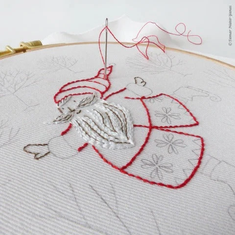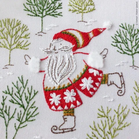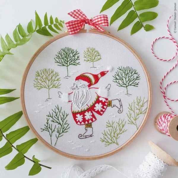 Add a playful spin to your holiday stitching with this joyful embroidery kit by artist and children’s book illustrator Tamar Nahir-Yanai. Featuring a whimsical Santa gliding through a snowy forest in a flower-trimmed outfit, this festive design is full of personality and charm.