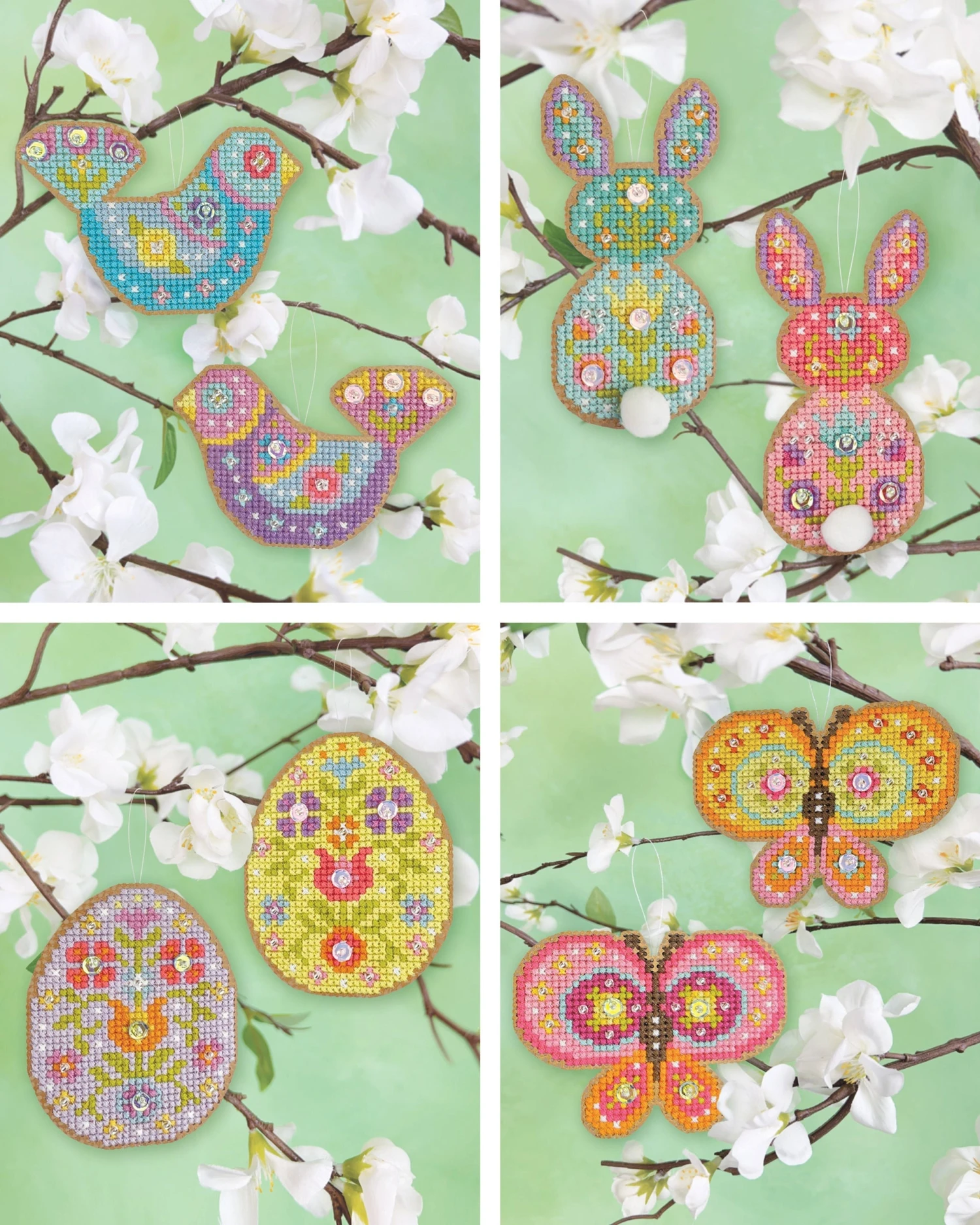 Add some sparkle to your Spring with this sweet and simple cross stitch kit! Each kit makes two mini butterfly ornaments embellished with beads and sequins.