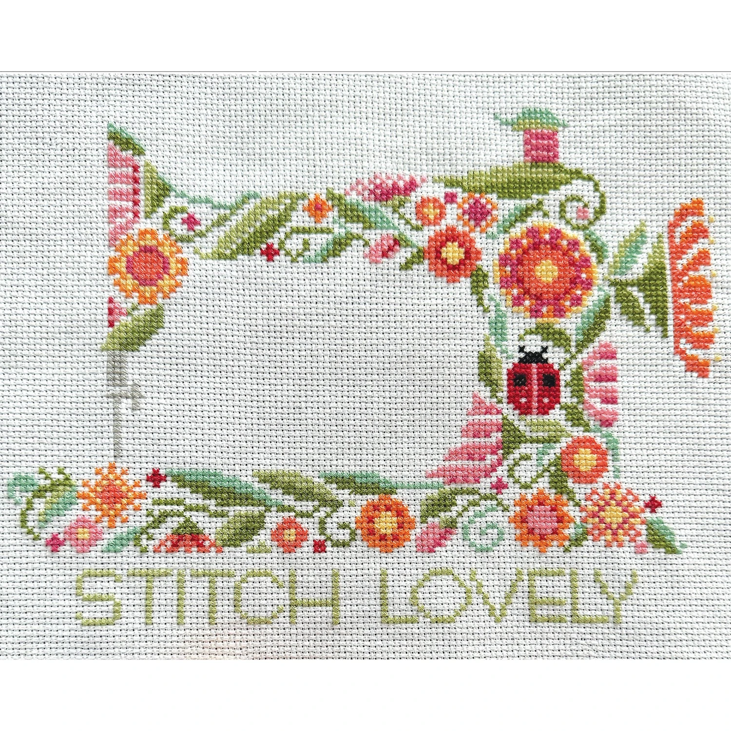 Blooming flowers make up a retro sewing machine iin this counted cross stitch pattern by Robin Pickens. Pink, yellow, orange flowers with green leaves are visited by a ladybug friend.