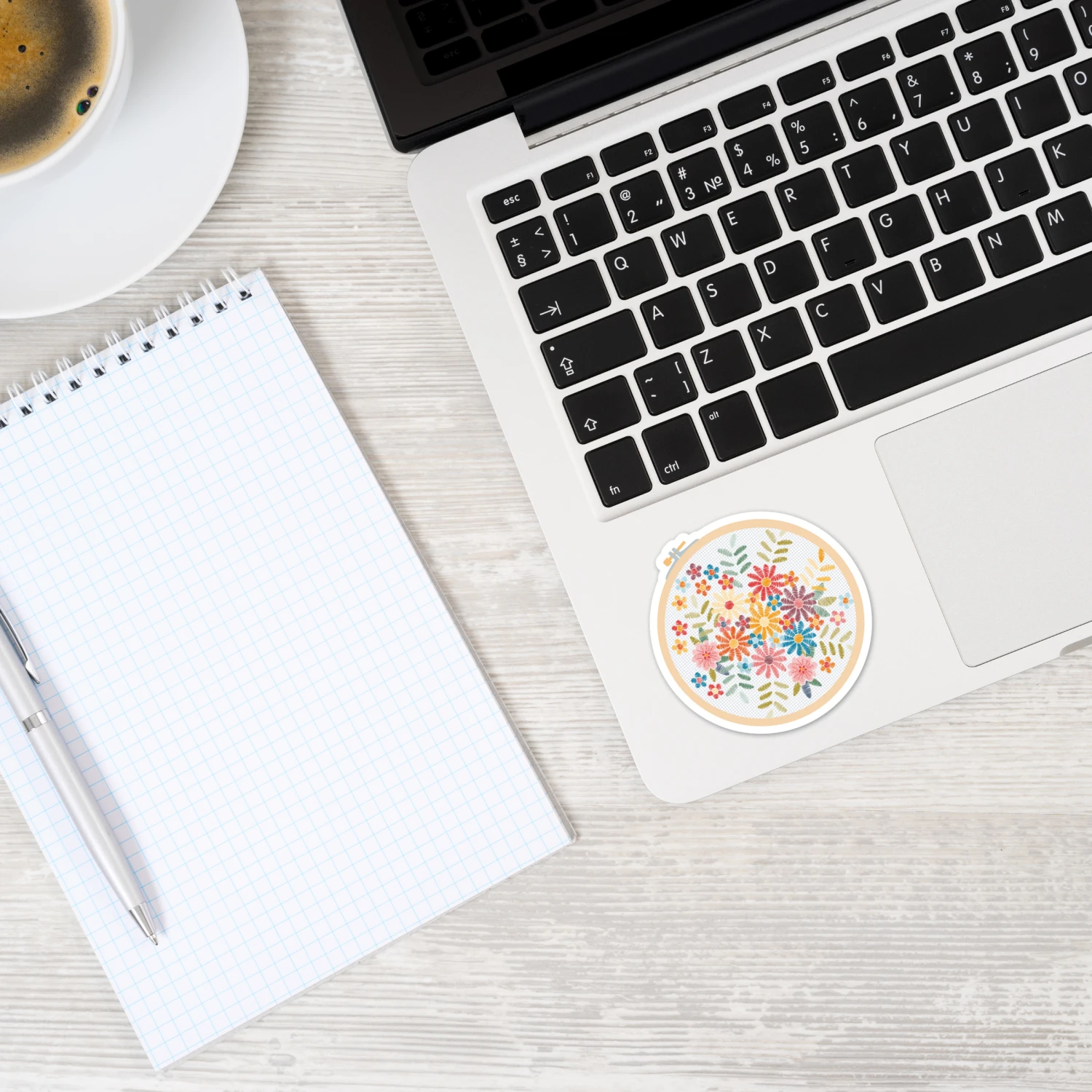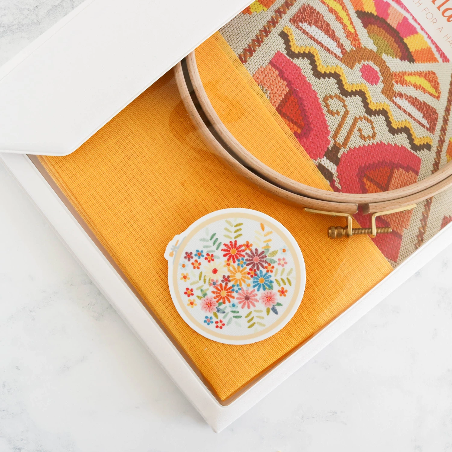 Show your stitchy spirit with a fun and colorful sticker! This design features a pretty floral embroidery framed in a wooden hoop.