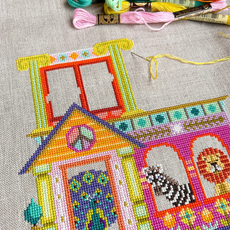 This cross stitch pattern by Satsuma Street is a real zoo! Each room of this wild and wacky house features a different animal, including a zebra, giraffe, flamingos, and even a sloth. Perfect for a kid’s room or nursery decor, this vibrant project is a joy to stitch.