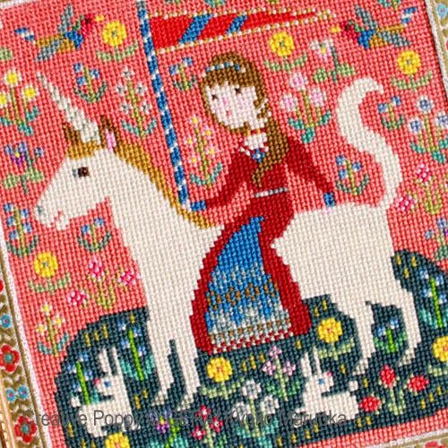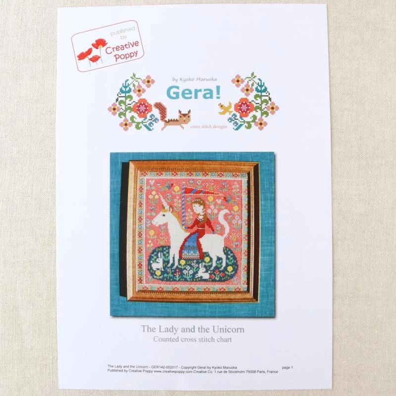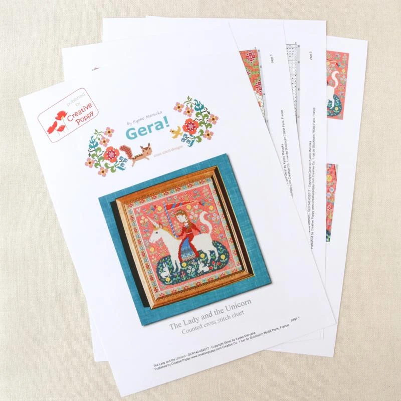 In this refined cross stitch piece, Gera! designer Kyoko Maruoka revisits the fascinating theme of the Lady and the Unicorn originally pictured in a medieval French tapestry. In this interpretaion, the lady is picture elegantly seated on a unicorn surrounded by lush, abundant flowers. Two little rabbits play below in the grass while birds fly above.