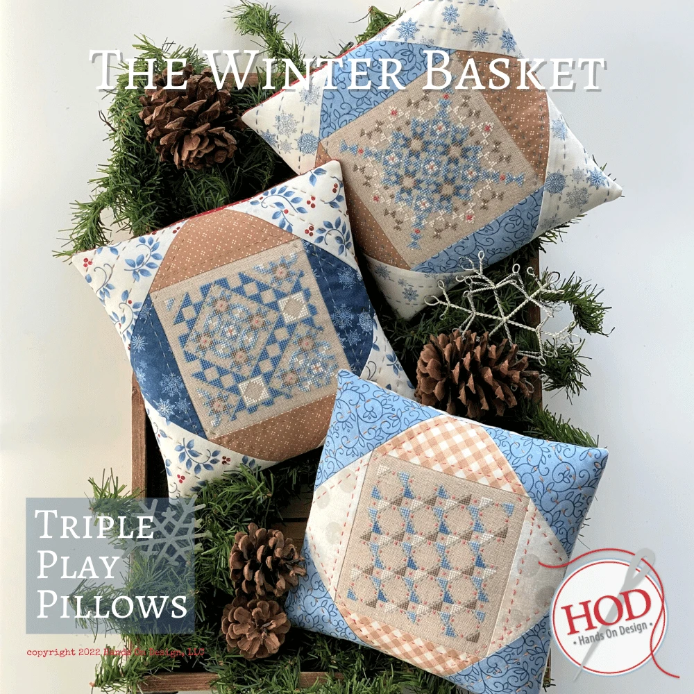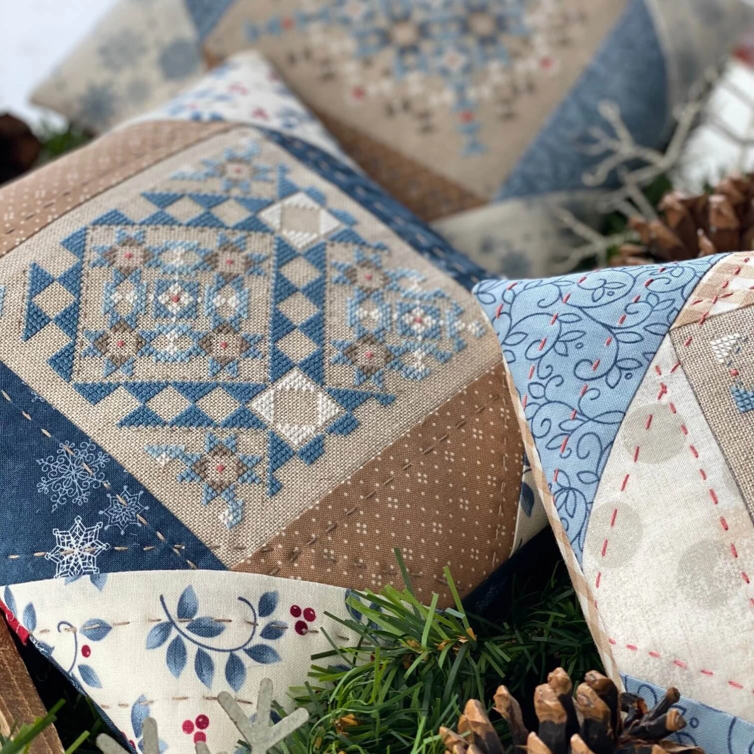 Stitch up three mini pillows with this seasonal quilt-inspired cross stitch pattern by Hands on Design. The pattern includes charts for all three designs, along with sourcing information for the quilt fabric used to sew the pillows and a link to a finishing tutorial.