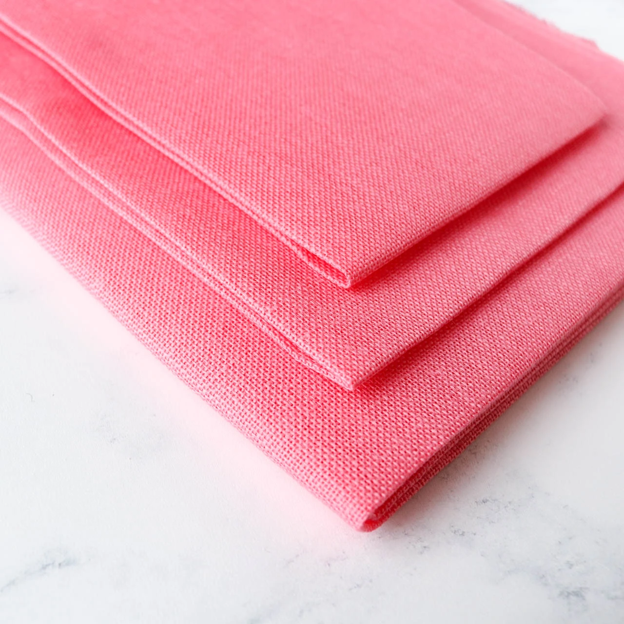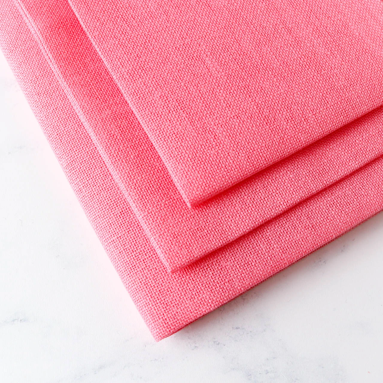 Linen has an open weave and a refined look that is perfect for cross stitch and embroidery. This bright pink linen is the equivalent of DMC embroidery floss color #957. The linen is stiff to start, but will soften up as you work with it.