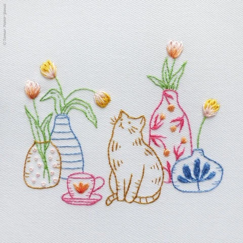 Soft florals, playful ceramics, and a curious cat—this charming embroidery kit by artist and children’s book illustrator Tamar Nahir-Yanai tells a quiet little story in stitches. The delicate tulips and hand-drawn style give this piece a light, cheerful feel that’s perfect for cat lovers and floral fans alike.