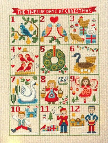 This cross stitch pattern by Tiny Modernist is a fun interpretation of a holiday classic. You will find five golden rings, a leaping lord in velvet pants and brocade vest, calling birds in a golden cage, three french hens with gifts, a lady dancing, and more! When stitched on 14-count Aida or 28-count linen, the piece will fit in a standard 12″ x 16″ frame.