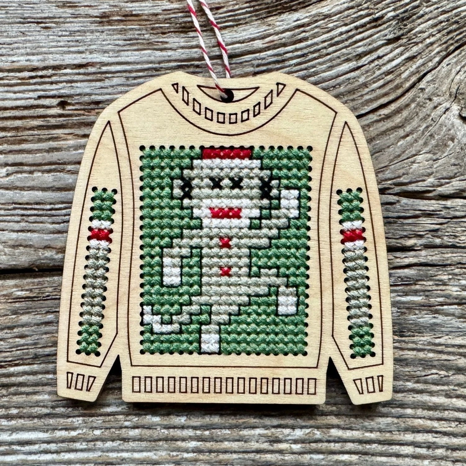 Ugly sweaters are even better when they’re done in cross stitch! This dancing sock monkey ugly sweater cross stitch ornament is an easy DIY that comes together in a few short hours. It’s made from laser cut wood, and is a great project for beginners.
