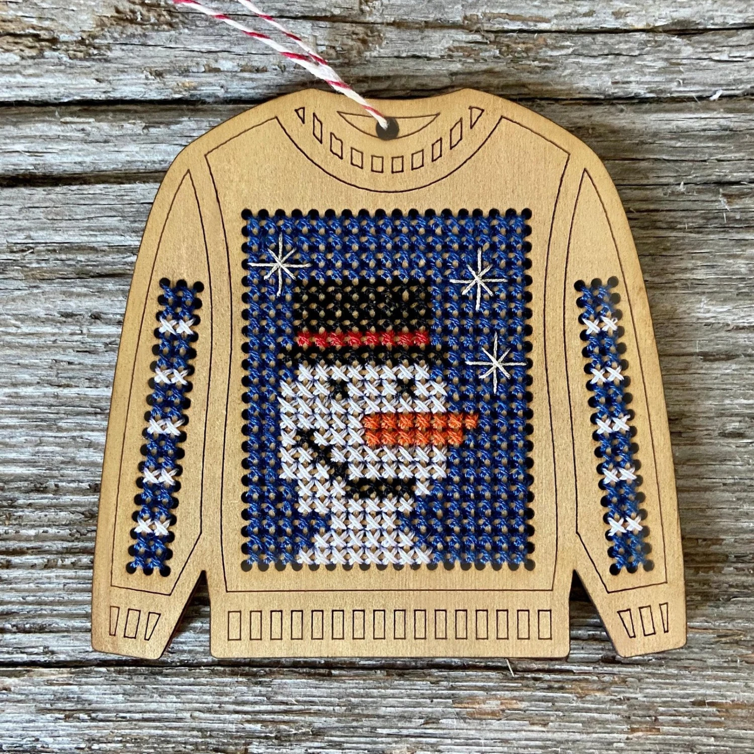 Ugly sweaters are even better when they’re done in cross stitch! This snowman ugly sweater cross stitch ornament is an easy DIY that comes together in a few short hours. It’s made from laser cut wood, and is a great project for beginners.