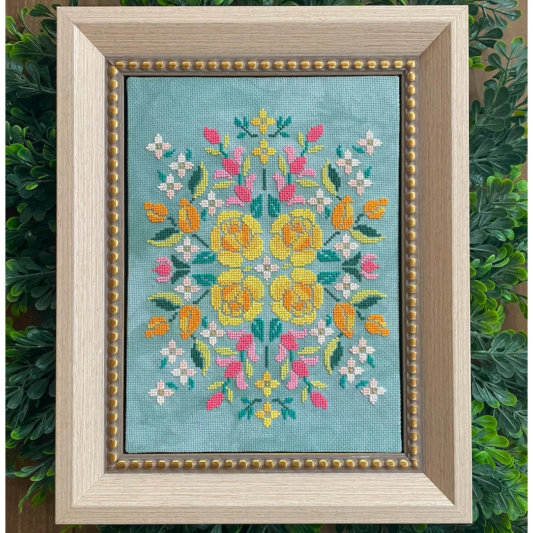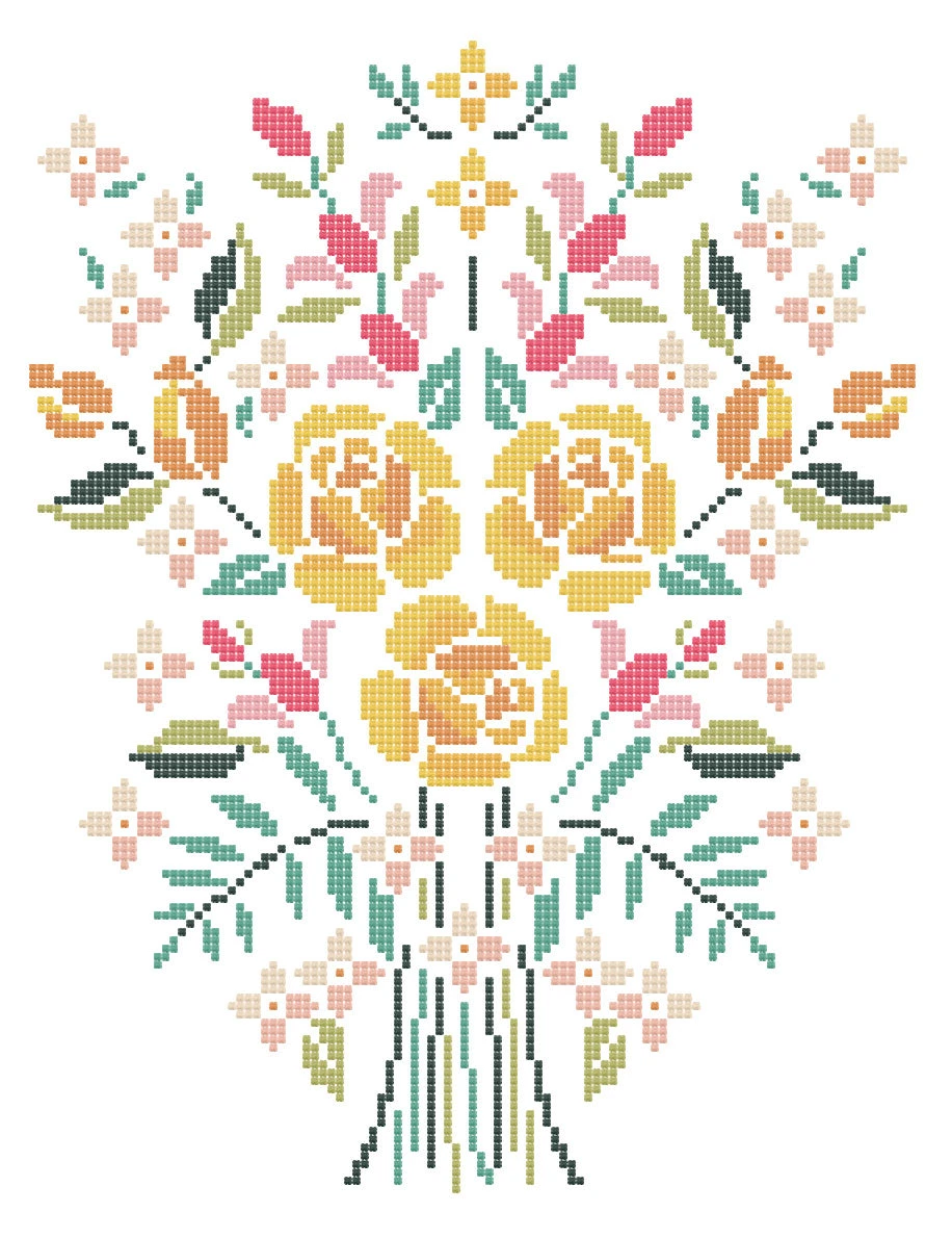 This counted cross stitch pattern by Petal Pusher was inspired by a partially finished cross stitch tablecloth found on a thrifting adventure. The pattern includes two charts: one a centerpiece layout (shown on blue) and the second a bouquet (shown rendered on white), so you can choose the one you like best!