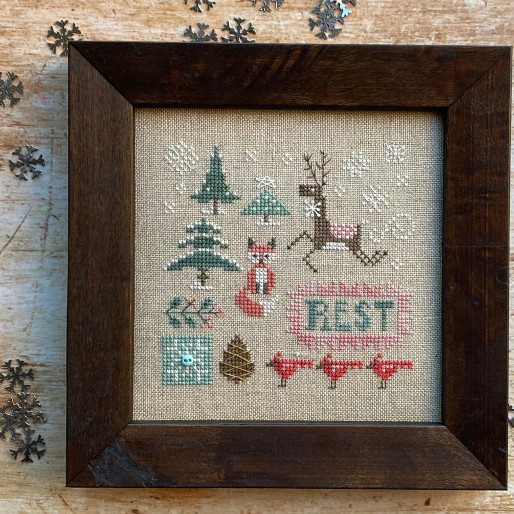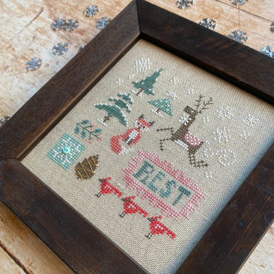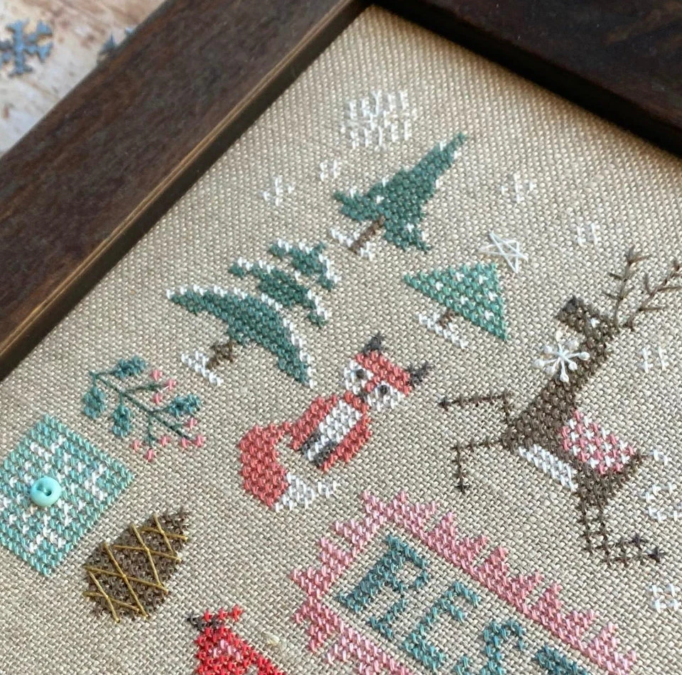 * The model for this design was stitched with overdyed thread and linen. Our bundles substitute DMC thread and standard Aida and linen. If you purchase a bundle, note that the finished piece will not have the same degree of color variegation as the model.