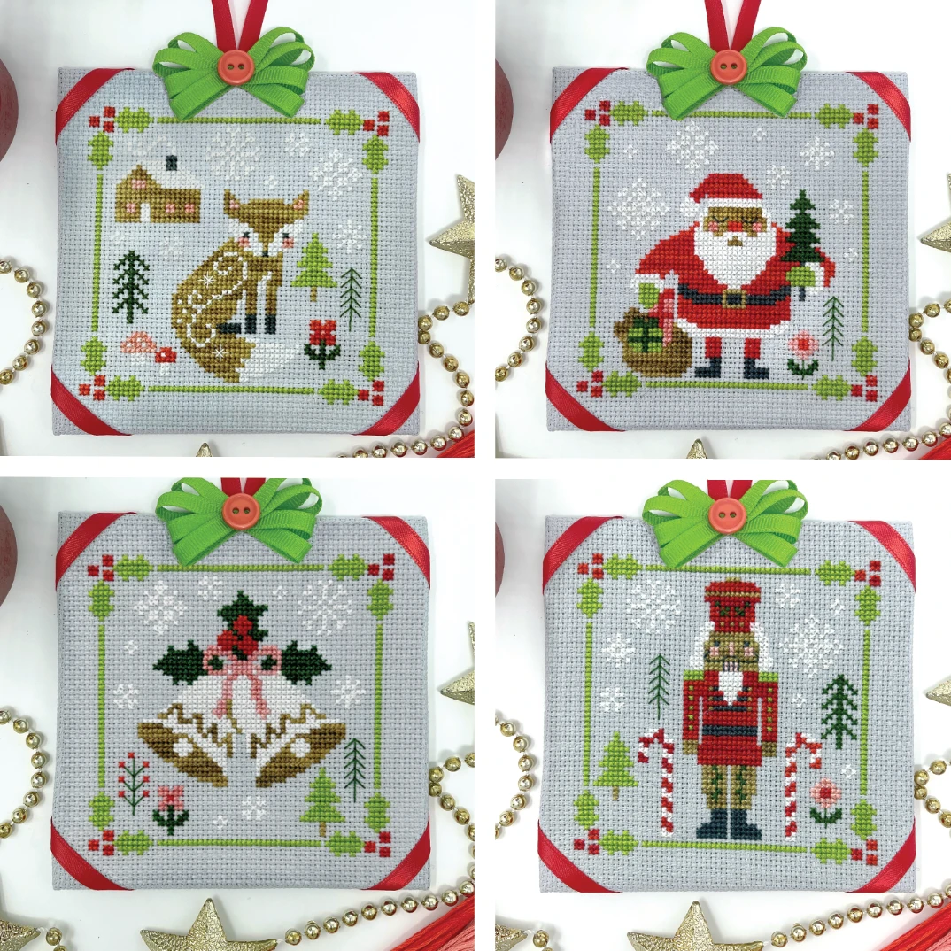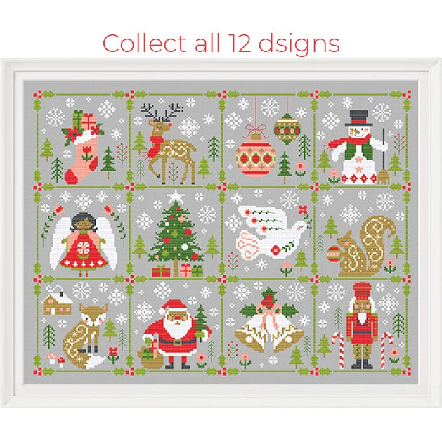 A total of 12 designs will be released in sets of four through December 2024. If you wish to stitch all 12 designs together, you will need a piece of fabric that measures at least 19″ x 23″ for 14-count, or 17″ x 21″ for 16-count.