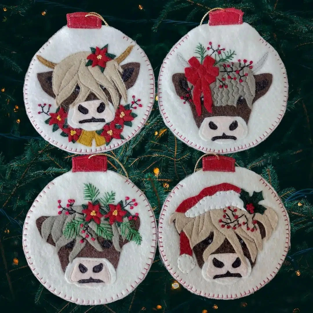 Just take a look at these charming Highlander cows all decked out for the Christmas season! Make your own set with this wool felt appliqué kit. There is enough material to make all four designs, so you can give some away and still have one to hang on your tree!