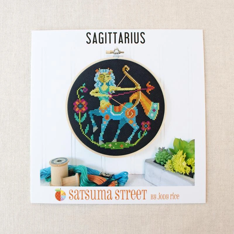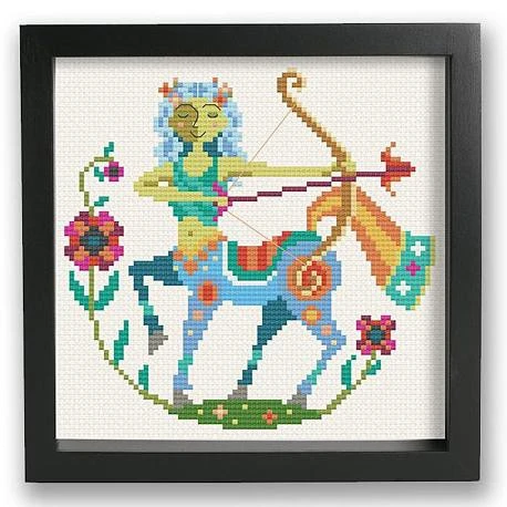 Those born under the sign of Sagittarius (November 22 – December 21) are optimistic, intellectual, and adventurous, and they are sure to love this cross stitch pattern by Satsuma Street. Part of their Zodiac series, the design features a modern folk art style with a vibrant color palette. The model is stitched on black Aida, but it would look great on lighter fabric too.