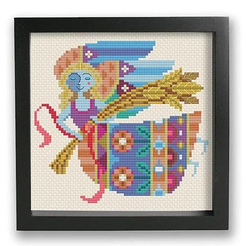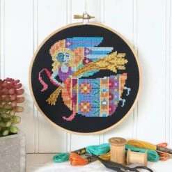 Born between August 23 and September 23, Virgos are meticulous, kind, and modest, and Virgos are sure to love this cross stitch pattern by Satsuma Street. Part of their Zodiac series, the design depicts the goddess Virgo in a modern folk art style with a vibrant color palette. The model is stitched on black Aida, but it would look great on lighter fabric too.